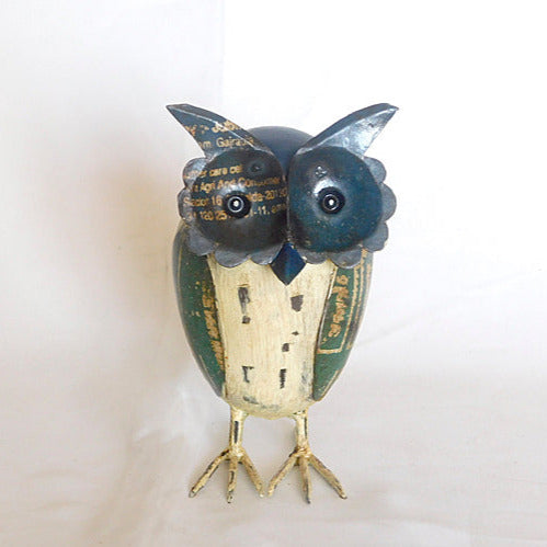Blue Mama Owl is approximately 8" x 4.5" x 3" and is recycled from metal drums or barrels. She's got larger and smaller family members. Our Recycled Metal Animals are ethically handmade exclusively for us in India. Sure to make your home or garden a happier place.